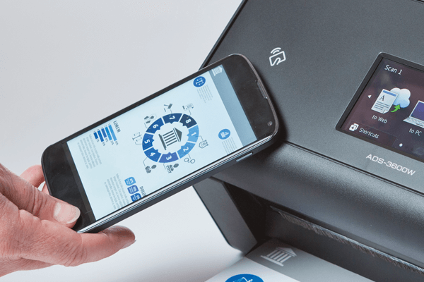 NFC (Near Field Connectivity) capability automatically establishes a direct connection between your NFC enabled smartphone or tablet and an NFC compatible Brother device. You can print or scan using the Brother iPrint&Scan app without connecting to a wireless network or entering any passwords.