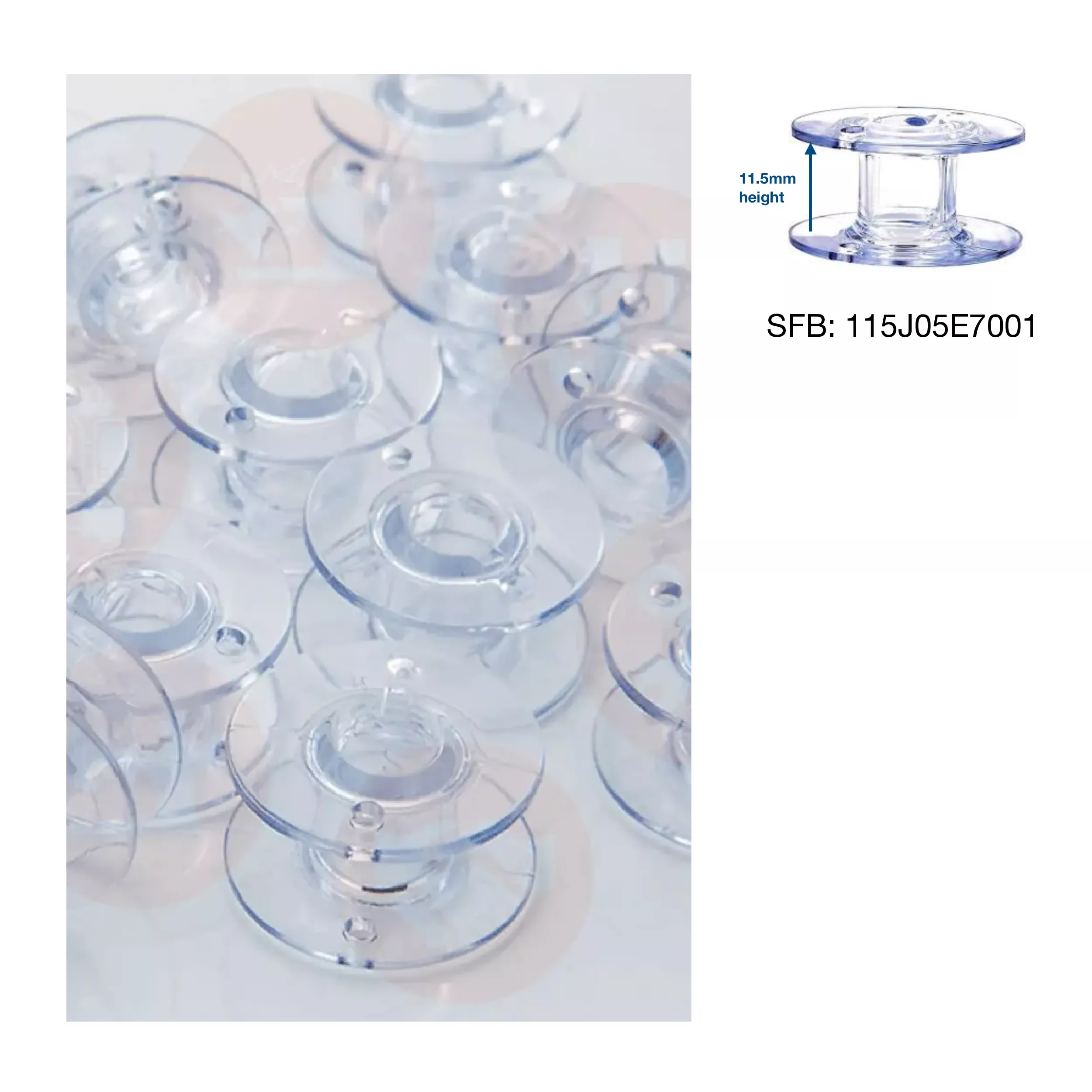 High Quality Clear Plastic Bobbins - 11.5 mm. Security notch for consistent bobbin thread winding. 10 bobbins per pack.